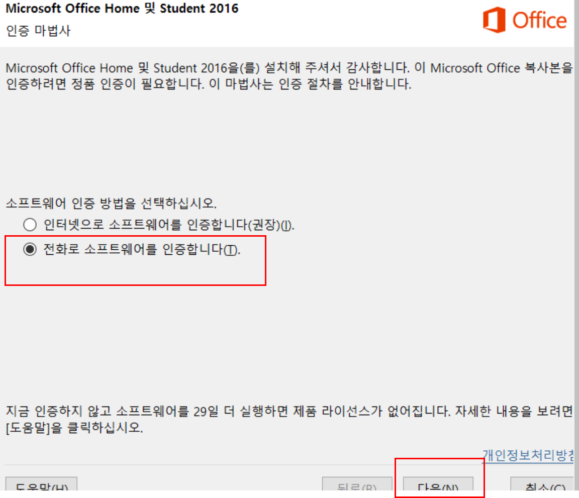 2. 우측 상단에 신규 ms계정이 로그인 된 것을 확인하고 '전화로 소프트웨어를 인증합니다'를 선택 후 '다음' 버튼을 눌러주세요