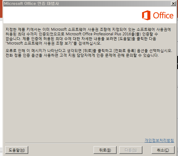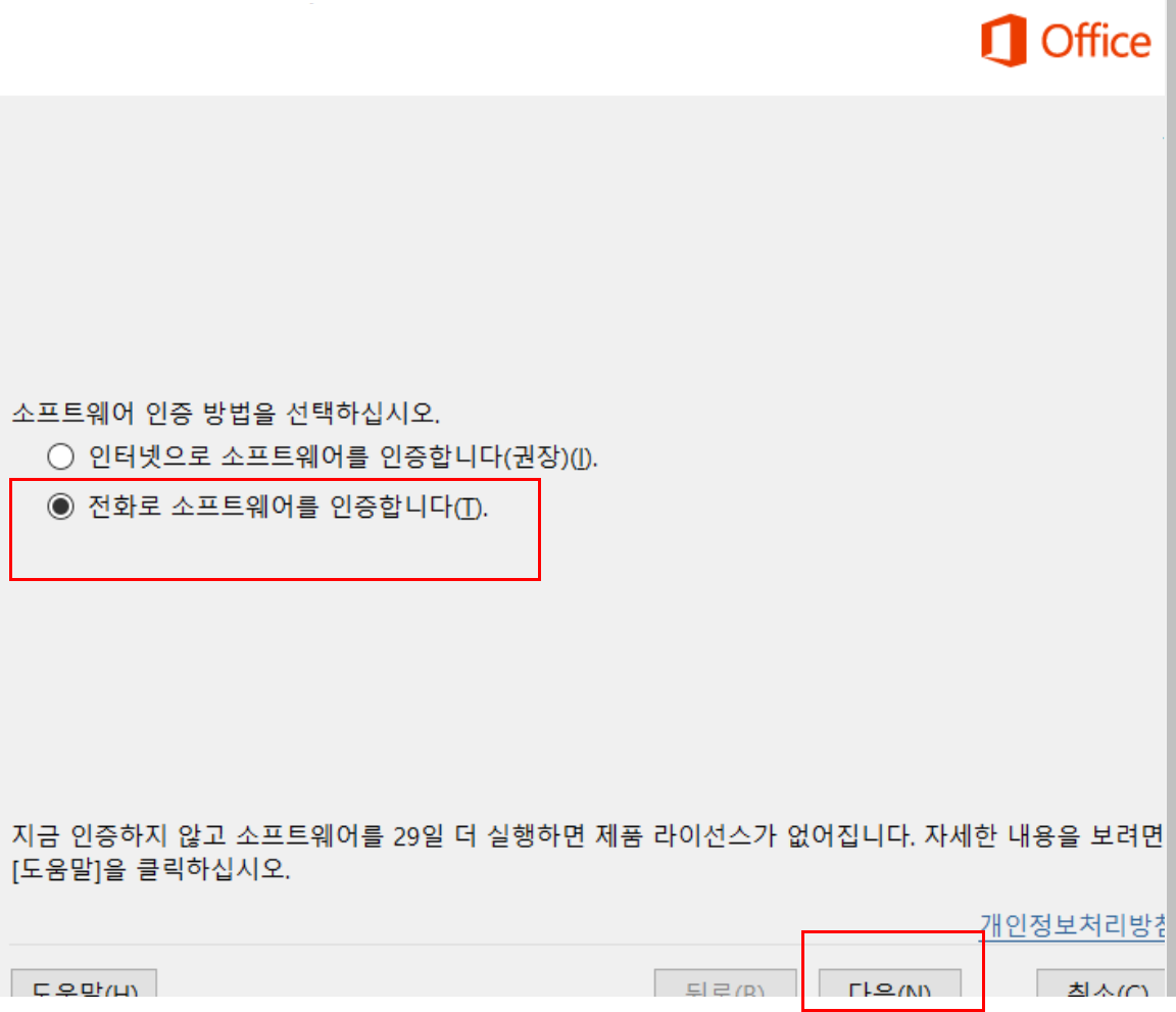 여기서 '전화로 소프트웨어를 인증합니다.' 를 선택 후 '다음'을 눌러주시기 바랍니다.