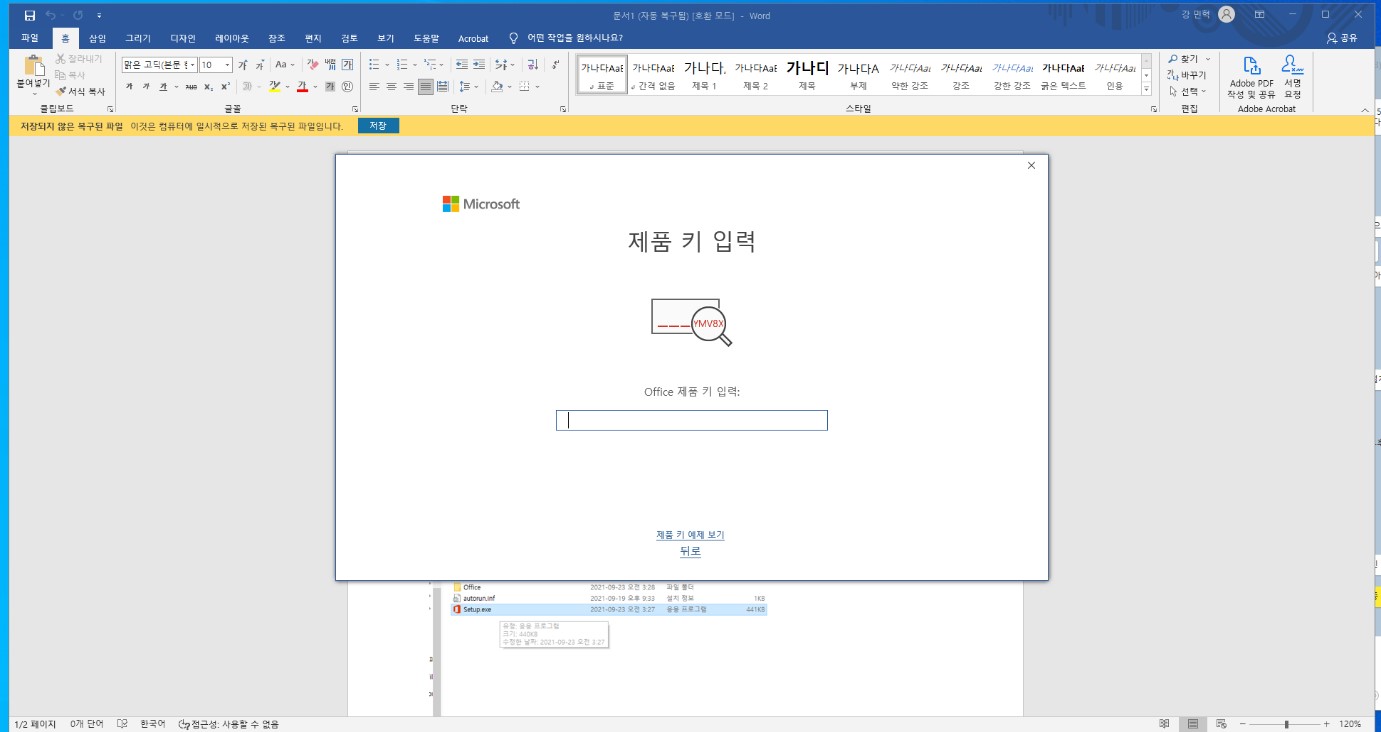 오피스 2021 Pro Plus 설치 완료 후 제품키를 넣고 '워드(word)'를 껐다 재실행 해보세요.